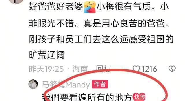 马筱梅在评论区留言表示:要看遍所有的地方!这样不仅可以促进爸爸汪小菲,后妈马筱梅与一对儿女们的感情,而且大人,小孩都是可以增广见识。有共同的经验,共同做一件事情,日后彼此之间有更多的话题可聊。能够收获这般的效果,实现愿望都是汪小菲的经济实力。