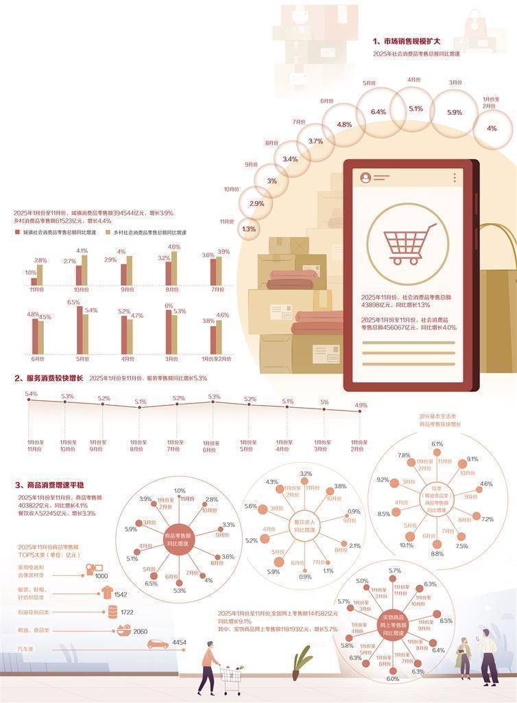r消费不仅关系经济发展,也关系民生改善。2025年前11个月,我国消费市场交出了一份稳健的成绩单:社会消费品零售总额达45.6万亿元,同比增长4.0%,累计增速快于上年同期0.5个百分点。消费市场亮点纷呈,文娱类和信息类服务消费需求较快释放,服务零售增长加快;消费新业态新模式蓬勃发展,线上消费占比提升。