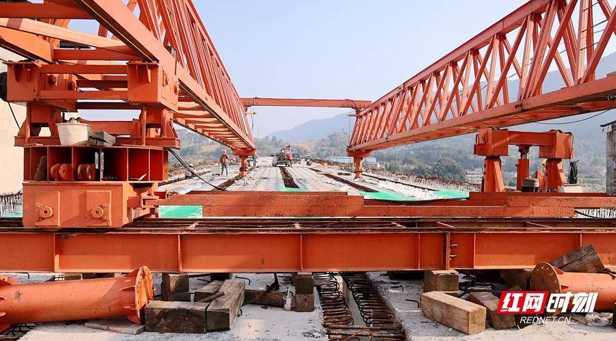 S343双牌县漯屋至何家洞一期工程项目,起点位于河东漯屋片区,线路全长2.116公里,设双向四车道。工程以路基市政与桥梁建设为核心,其中桥梁工程涵盖潇水二桥、谢山里大桥及油茶桥,桥梁段全长0.977公里。作为项目关键控制性工程,潇水二桥上跨现有永水路(G207线)形成立体交叉,最终经回旋绕行路线与永水路平面衔接,桥梁全长576米、宽度18.5米,设计时速40公里,桥面采用沥青砼路面,兼具通行安全性与舒适性。记者在潇水二桥贯通现场看到,桥面主体架构已然成型,后续施工正有序进行。“后期主要推进桥面铺装、照明设施安装、安全标识标牌制作及沥青路面铺设等工作。”S343项目业主建设单位负责人蒋再明介绍。